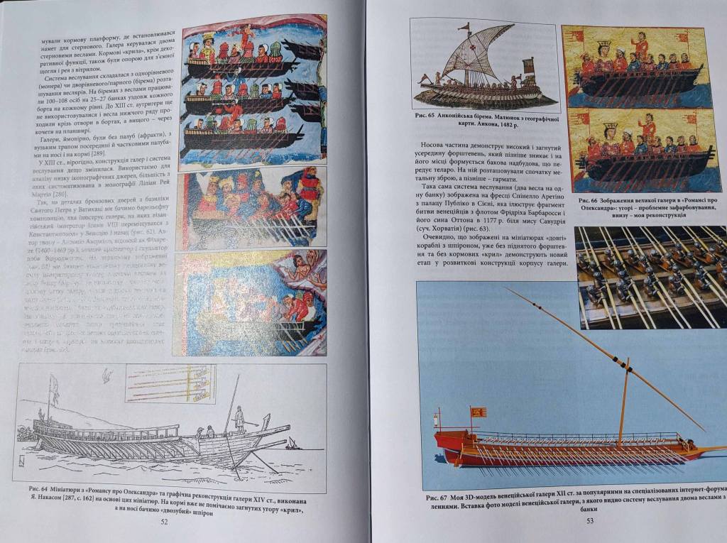 Отож, цю книжку варто спочатку просто погортати й почитати підписи під малюнками. Ви прокачаєте свої скіли бувалого галерника, навіть якщо не знайдете потім часу її прочитати. Іноді здається що ілюстрацій занадто багато. Тут чотири панорами давньої Венеції і сім (!) зображень давньої Генуї на середньовічних картинах та картах-портоланах турецького адмірала. Іноді закрадається думка, що пан Ігор подав усі зображення давнього Дубровніка чи Судака, які взагалі дійшли до наших днів. Такі ж багаточисельні, з докладними поясненнями, типи середземноморських галер ще й хронологічному порядку. І в спадному порядку за розмірами: галера – фуста – галеота – бригантина – саєта – фрегат – фелука – сандал. Це не та бригантина, не той фрегат і не той сандаль.