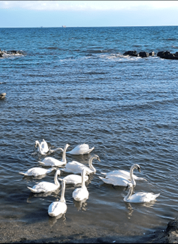 Лебеді теж доволі часто з’являються, чекають коли їх накромлять хлібом.