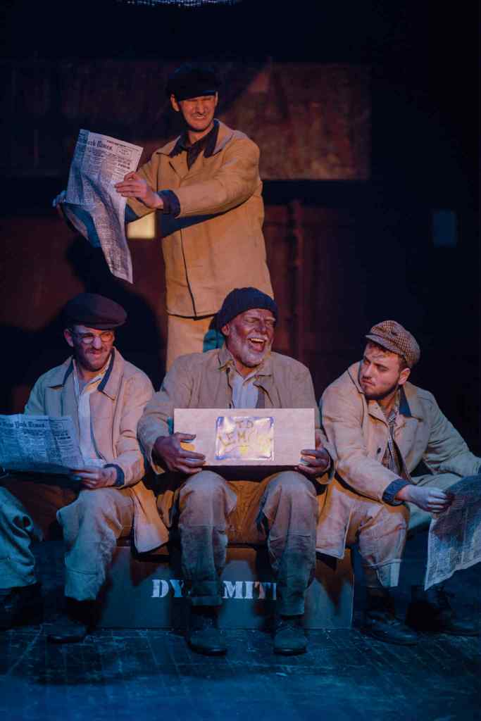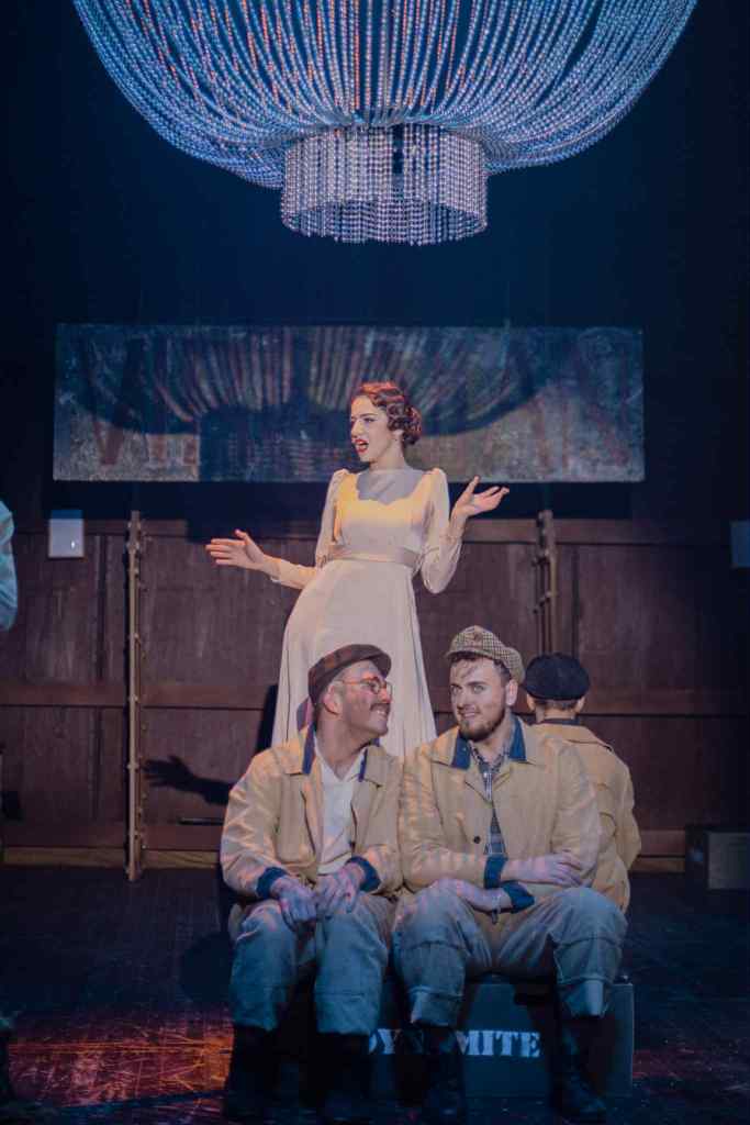 Так, дерев’яні театральні підмостки цілком природно сприймаються як палуба лайнера. А концертний рояль, який обертається на тій палубі, іноді здається головною дієвою особою цієї п’єси. Принаймні, він найскладніша деталь спартанського реквізиту, якщо не рахувати рятувальний човен, кочегарські лопати і ящики з динамітом. Динаміт умовний, а лопати справжні, і на них навіть виконають ритмічну партію ударних у сцені в кочегарці. Чомусь усі «матроси» цієї вистави (Владислав Цобенко, Павло Примак, Ярослав Бабич) одягнені саме як кочегари – в брезентових робах і навіть так званих «гадах» – кирзових черевиках із залізними заклепками. Я недарма згадував сині блузи Брехта. Більше того, в таких суднових «гадах» виходить на сцену і Трубач – наратор, від лиця якого оповідається історія (заслужений артист Олександр Ярошенко). В певних епізодах йому доводиться вдягати фрак (іноді чорний, іноді білий), і в сполученні з «гадами» це виглядає справді іронічно. Навіть хочеться вгадувати, яких кочегарів чи зварювальників роздягнула художниця костюмів Оксана Тернавська. Ближче всього до театру Василька судноремонтний завод «Україна». Хай там як, навіть в цьому відчувається, що ми в Одесі. В Києві правильних гадів не дістанеш.
