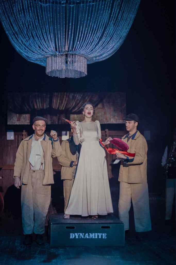 А є ще персонаж-посилання і на бродвейський фільм «Кабаре» – мім з набіленим обличчям, який зображає озвучене оповідачем-Трубачем пластично, і звісно, декадентська солістка цього джаз-бенду. Одеську Лайзу Мінеллі звуть Марія Буймович. Стильна штучка часів панування чарльстона і шиммі, яку наче саме з Бродвею 1920-х перенесло на вулицю Пастера 2020-х. Знову ж таки, мені залишається лише шкодувати про своє невігластво щодо виконаних англійською пісень, фасону плаття з голою спиною і назви зачіски, наче з «Великого Гетсбі».